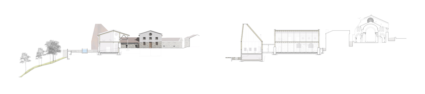 THE NEW VOLUMETRICS ARE BASED ON THIS. BY DISMANTLE THE RESIDENTIAL BUILDING IN THE CENTER, THE PLANNED CLOISTER AND COURTYARD SPACE WILL BE EXPOSED AGAIN. WITH THE NEW VOLUMES, THE NOW EXPANDED COURTYARD SPACE IS CLOSED AGAIN. ON THE OUTSIDE, THE PROJECT IS BASED ON THE EXISTING PLATFORMS, WHICH ARE USED FOR AGRICULTURAL